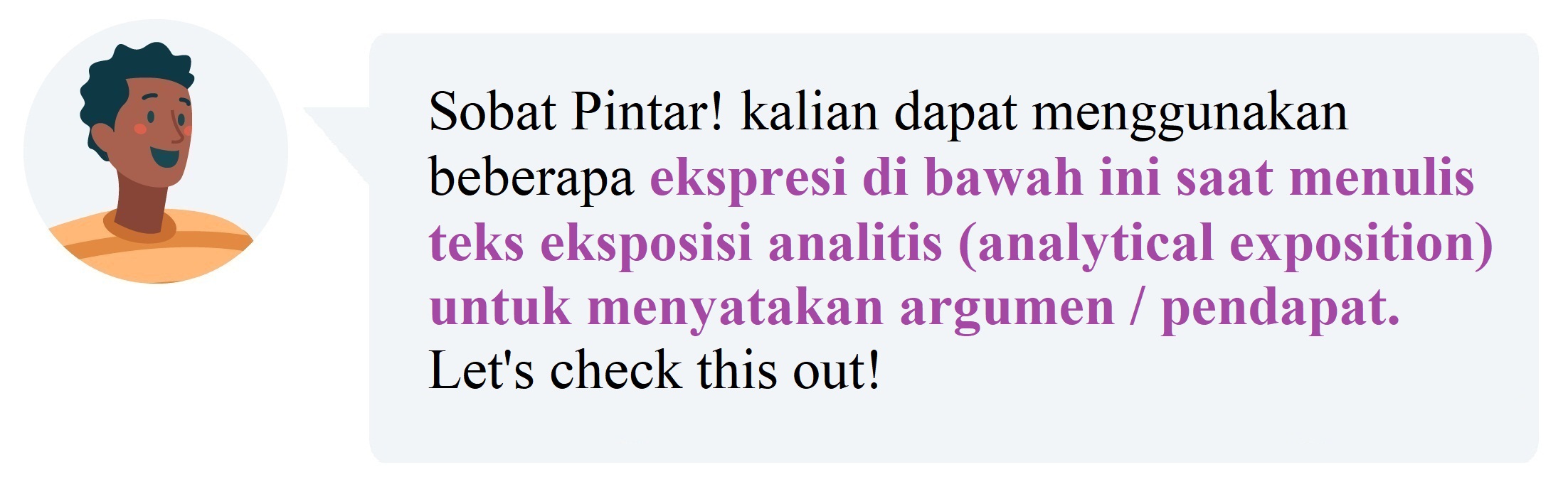 Sobat Pintar, kalian dapat menggunakan beberapa ekspresi di bawah ini saat menulis teks eksposisi analitis (analytical exposition) untuk menyatakan argumen / pendapat.