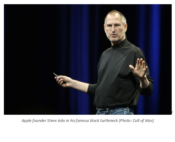 Caption tersebut berbunyi "Apple founder Steve Jobs in his famous black turtleneck"