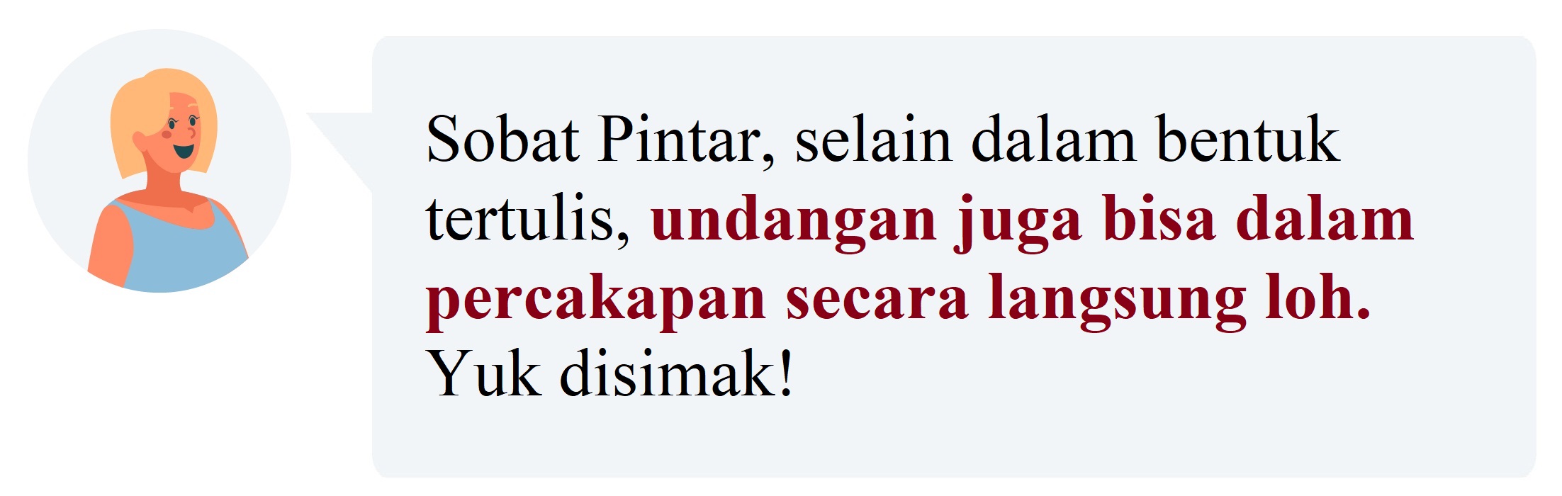 Sobat Pintar, selain dalam bentuk tertulis, undangan juga bisa dalam percakapan secara langsung, contohnya dengan rekan kerja, boss ataupun teman sebaya