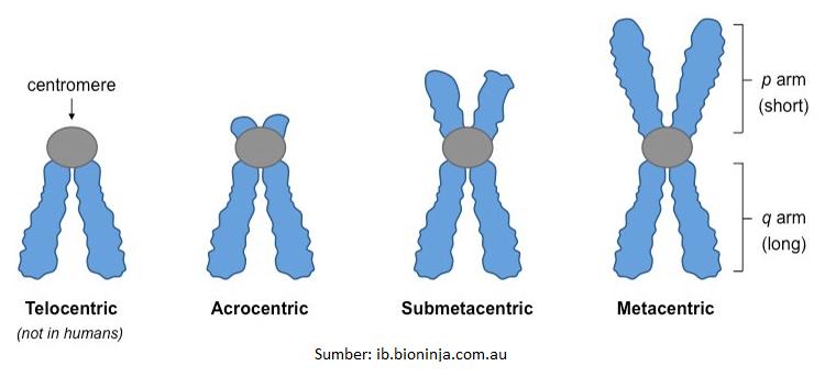 Berdasarkan letak sentromernya, bentuk kromosom dikelompokkan menjadi empat, yaitu:
