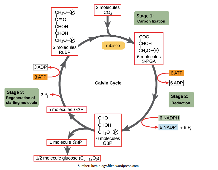 Siklus Calvin terjadi pada bagian kloroplas yaitu stroma. Pada reaksi gelap, bahan untuk fotosintesis (CO2) nantinya akan dibentuk menjadi molekul gula setelah melalui 3 tahapan, antara lain Fiksasi Karbon, Reduksi dan Pembentukan kembali (regenerasi) RuBP seperti gambar berikut.