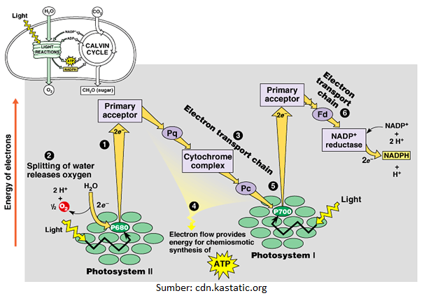 • Reaksi terang: terjadi di tilakoid atau grana. Pada reaksi ini terjadi fotolisis atau pemecahan air yang menghasilkan ion H+ dan oksigen.