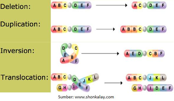 - Duplikasi, mutasi kromosom dimana sebagian kromosom bereplikasi menyebabkan bertambahnya gen yang sama dalam satu bagian.