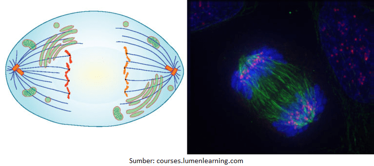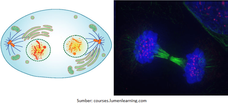 - Telofase, terbentuk 2 sel yang telah memiliki materi genetik.