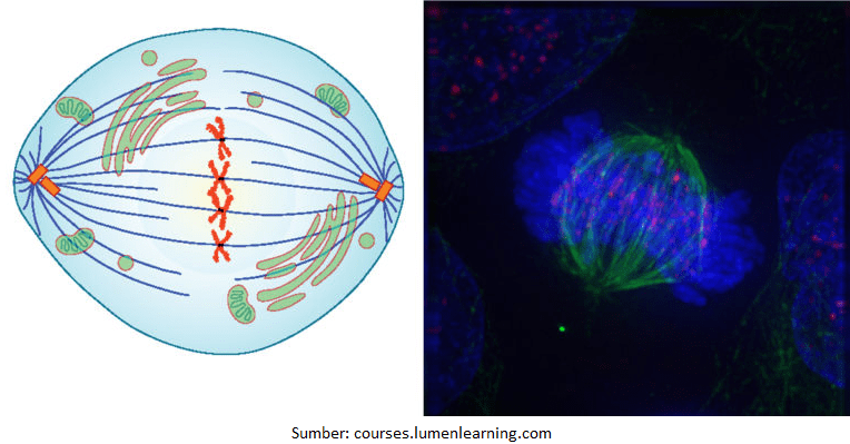 Dengan letak kromosom berada di bidang pembelahan, maka pembagian jumlah informasi DNA yang akan diberikan kepada sel anakan yang baru, benar-benar rata dan sama jumlahnya. Tahapan ini merupakan akhir dari metafase.