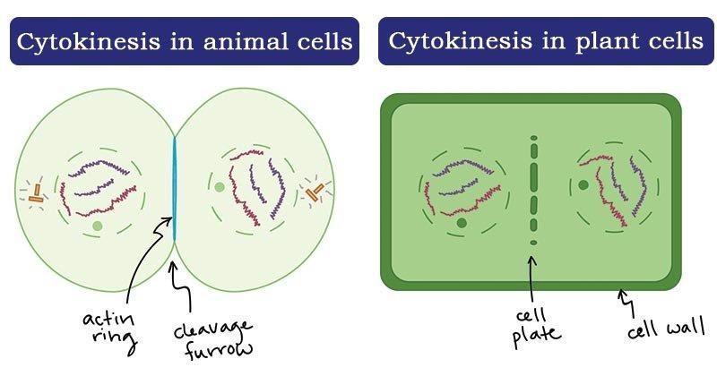 Agar kedua inti terpisah menjadi sel baru, perlu adanya pembelahan sitoplasma yang disebut sitokinesis. Sitokinesis terjadi, segera setelah telofase selesai. Pada fase sitokinesis terjadi pembelahan sitoplasma diikuti pembentukan sekat sel baru, sehingga terbentuk dua sel anakan.