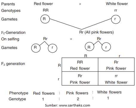 Dari diagram dan tabel dapat dilihat perbandingan fenotipe dan F2 adalah 1 : 2 : 1 = merah : merah muda : putih, sedangkan perbandingan genotipenya F2 dapat dilihat 1 : 2 : 1 = RR : Rr : rr