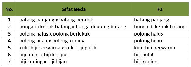 Dari hasil pengamatannya pada keturunan pertama (F1) menunjukkan ciri-ciri yang sama dengan salah satu induknya.
