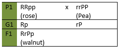 Ayam jantan berpial Ros disilangkan dengan ayam betina berpial Biji menghasilkan keturunan F1 bergenotip RrPp. Jika keturunan F1 (RrPp = walnut) disilangkan sesamanya (RrPp), kemungkinan Fenotip yang muncul dari persilangan tersebut adalah....