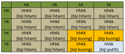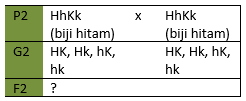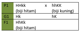 Disilangkan gandum berbiji hitam (HHkk) dengan gandum berbiji kuning (hhKK) dan dihasilkan F1 dengan fenotip F1 100% pada berbiji hitam. Jika F1 disilangkan dengan sesamanya, ratio fenotip F2 adalah....