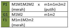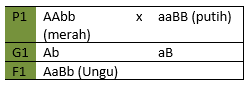 Ratio Fenotip F2 = ungu : merah : putih = 9 : 3 : 4