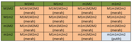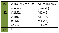Disilangkan gandum berbiji merah (M1M1M2M2) dengan gandum berbiji putih (m1m1m2m2), dihasilkan F1 semua gandum berbiji merah. Apabila F1 disilangkan dengan sesamanya, maka rasio fenotif F2 adalah....