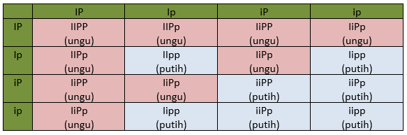 Ratio Fenotip F2 = ungu : putih = 9 : 7