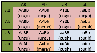 - Ungu (AABB, AABb, dan AaBb) : 9