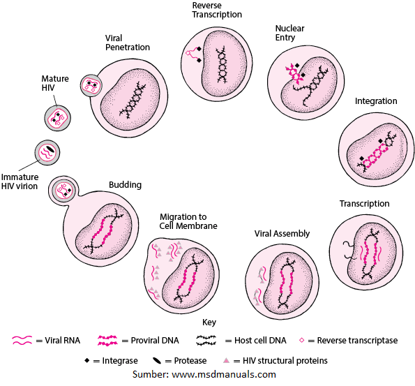 - Enzim virus mereplikasi RNA menjadi DNA dan bergabung dengan DNA sel T