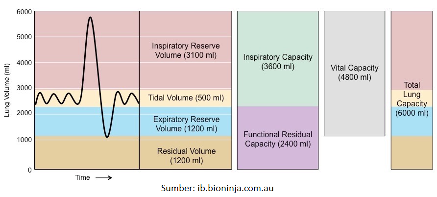 Apabila kita bernapas biasa, volume udara yang dapat keluar masuk lebih kurang 500 ml. Udara ini biasa disebut udara tidal. Jika kita menarik napas dalam-dalam maka volume udara yang masih dapat masuk sekitar 1.500 ml. Udara ini disebut udara komplementer. Sebaliknya, udara suplementer adalah jika kita menghembuskan napas sekuat-kuatnya masih dapat mengeluarkan volume udara sebanyak 1.500 ml.