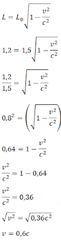 Sebuah balok kayu yang diukur saat bergerak menyusut sebesar 30cm dari panjang benda yang diukur dalam keadaan diam. Bila panjang benda dalam keadaan diam sebesar 150cm dan kecepatan cahaya dinotasikan dengan c, berapa kecepatan benda tersebut dalam keadaan bergerak?