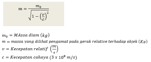 Untuk gerakan – gerakan benda dengan kecepatan relative kecil tidak terjadi perubahan massa. Perubahan itu baru tampak jika kecepatannya mendekati kecepatan cahaya. Oleh Einstein hubungan massa diam dan massa bergerak yang ditinjau oleh pengamat dirumuskan sebagai berikut :