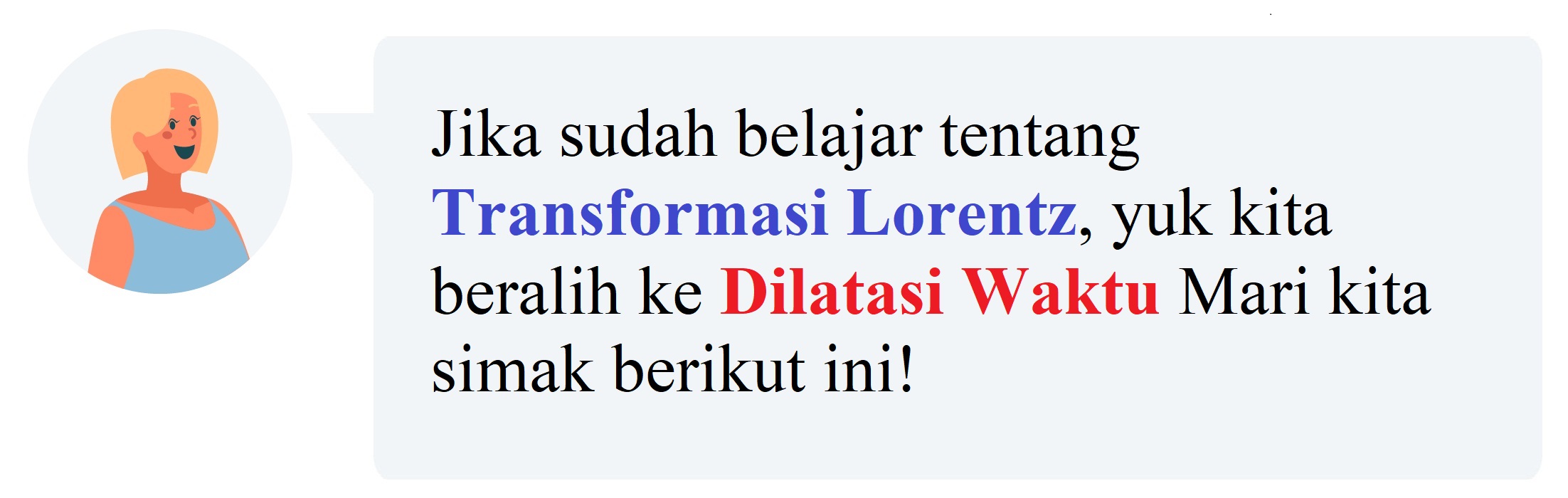 Pada transformasi Galileo telah dikemukakan bahwa selang waktu pengamatan terhadap suatu peristiwa yang diamati oleh pengamat yang diam dengan pengamat yang relatif bergerak terhadap peristiwa adalah sama (t - t’). Hal inilah yang menurut Einstein tidak benar, selang waktu pengamatan antara pengamat yang diam dan pengamat yang bergerak relatif adalah tidak sama (t ≠ t’). Transformasi Lorentz pertama kali dikemukaan oleh Hendrik A. Lorentz, seorang fisikawan dari Belanda pada tahun 1895. Sebagai gambaran coba kalian perhatikan gambar berikut!
