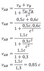 Seorang pengamat di bumi melihat dua pesawat antariksa A dan B yang bergerak berlawanan arah mendekati bumi dengan kelajuan masing-masing 0,5c dan 0,6c. Maka berapakah kelaajuan: