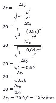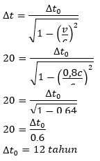 20 tahun waktu perjalanan di bumi dan menurut Anton adalah waktu yang dia lihat dari keadaan bergerak (Δt), maka waktu yang berjalan di dalam pesawat (Δt0):