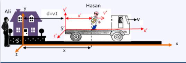 Karena waktu pengamatan oleh pengamat yang diam (Ali) pada kerangka acuan S dan pengamat yang bergerak (Hasan) pada kerangka acuan S’ hubungan transformasi pada Galileo haruslah mengandung suatu tetapan pengali yang disebut tetapan transformasi.logspot)