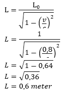 Sebuah kontainer berbentuk kubus mempunyai volume 1 m3 kalau diamati oleh pengamat yang membisu terhadap kontainer tersebut. Jika pengamat bergerak relatif terhadap kubus dengan kecepatan 0,8 c panjang rusuk kontiner yang teramati yakni ...