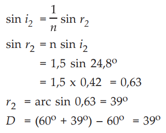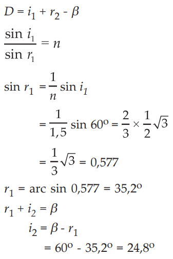 Sebuah prisma mempunyai sudut pembias 60o dan indeks biasnya1,5. Seberkas sinar datang pada salah satu sisi pembias prisma dengan sudut datang 60o, tentukan sudut deviasi yang terjadi pada prisma!