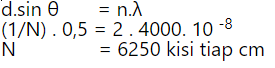Seberkas cahaya dengan panjang gelombang 4000 A datang pada suatu kisi. Jika pita terang orde kedua membentuk sudut 30° terhadap garis normal, maka dalam 1 cm terdapat celah sebanyak … .