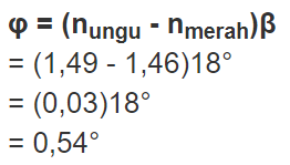 Prisma memiliki sudut pembias 18o. Jika indeks bias sinar merah adalah 1,46 dan indeks bias sinar ungu adalah 1,49. Berapakah besar sudut dispersi?