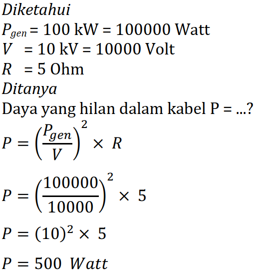 Sebuah generator menghasilkan daya 100 kW dengan beda potensial (V) sebesar 10 kV. Daya ditransmisikan melalui kabel dengan besar hambatan R sebesar 5 Ohm. Tentukan daya yang hilang dalam kabel.