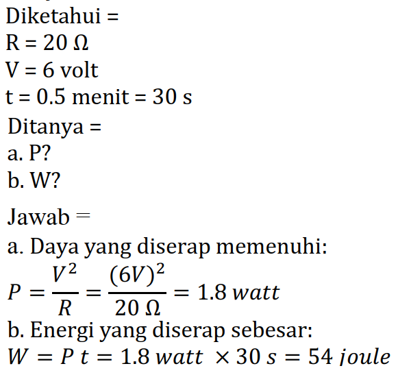 Sebuah hambatan 20 ohm dihubungkan pada baterai yang bertegangan 6 volt. Tentukan daya yang diserap hambatan dan energi yang diserap hambatan selama setengah menit!