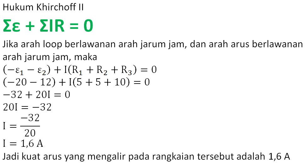 Nah, kalau Hukum II Kirchoff ini membahas tentang loop. Tujuan dari hukum ini adalah untuk menganalisis beda potensial (tegangan) pada suatu rangkaian tertutup. Bunyi Hukum II Kirchoff adalah: “Jumlah aljabar GGL dan jumlah penurunan tegangan (IR) sama dengan nol”.