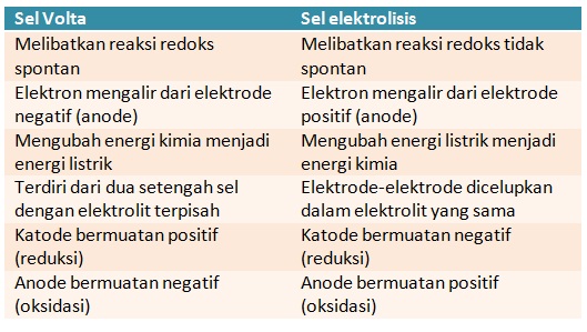 Sobat Pintar, di bawah ini merupakan tabel perbedaan antara Sel Volta dengan Sel Elektrolisis: