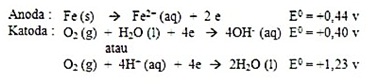 Ion besi (II) yang terbentuk pada anoda selanjutnya teroksidasi menjadi ion besi (III) yang kemudian membentuk senyawa oksida terhidrasi (karat besi), Fe2O3.xH2O.
