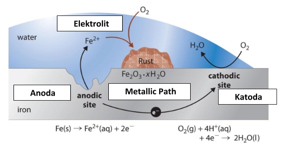 Proses korosi pada logam terutama besi disebabkan oleh permukaan logam mempunyai kerekatifan yang berbeda beda. Besi yang lebih reaktif akan mengalami reaksi oksidasi membentuk ion Fe2+ dan sejumlah elektron dan bertindak sebagai anode. Elektron yang dihasilkan akan mengalir ke bagian logam yang kurang reaktif yaitu bagian katode. Sementara itu ion Fe2+ yang dihasilkan akan masuk ke dalam air yang mengalami oksidasi lanjut membentuk ion Fe3+ yang kemudian akan senyawa oksida terhidrasi berupa Fe2O3.x H2O (karat besi yang rapuh).