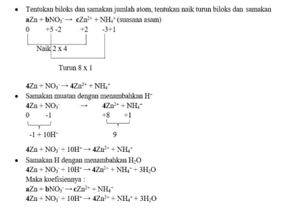 A Zn + b NO3- --> c ZN2+ + NH4+ (suasana asam)