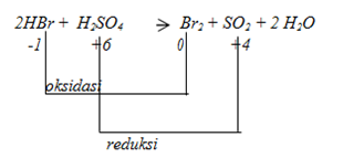 Perhatikan persamaan reaksi redoks berikut: 2HBr + H2SO4 --> Br2 + SO2 + 2H2O