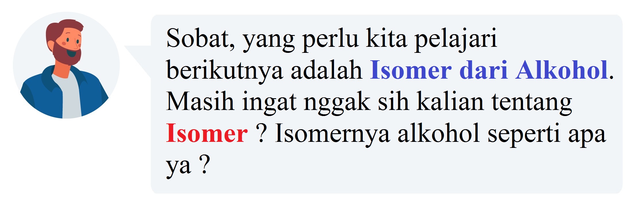 Sobat Pintar, tentu telah mempelajari isomer rangka pada alkana, alkena, dan alkuna serta isomer geometri pada alkena. Alkohol selain memiliki isomer rangka juga memiliki isomer posisi dan isomer fungsi.