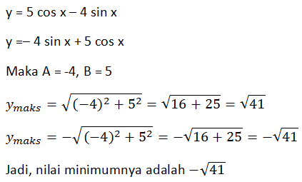 Nilai minimum dari fungsi y = 5 cos x – 4 sin x adalah ....