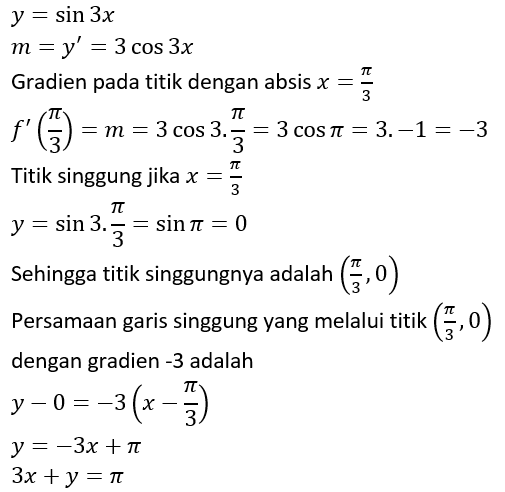 Nah, dalam menentukan gradien dari persamaan garis singgung, kita bisa memanfaatkan aplikasi turunan, Sobat.
