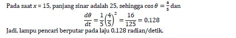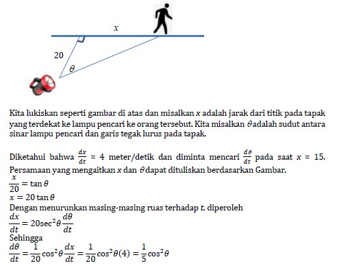 Seseorang berjalan menurut tapak lurus pada kecepatan 4 meter/detik. Lampu pencari terletak di tanah sejauh 20 meter dari tapak dan tetap dipusatkan pada orang itu. Pada laju berapa lampu pencari berputar jika orang itu berada 15 meter dari titik pada tapak yang terdekat ke lampu pencari?