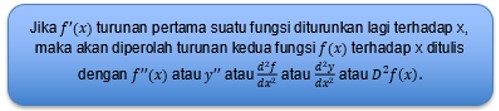 Jika f fungsi yang terturunkan, maka turunannya f' juga berupa fungsi, sehingga f' boleh jadi mempunyai turunan tersendiri, yang dinyatakan oleh (f')' = f''. Fungsi f'' yang baru ini disebut turunan kedua dari f karena dia berupa turunan dari turunan f.