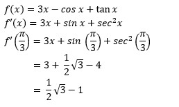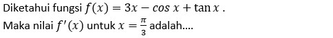 Jika f(x) = tan(3x2 + x – 1), nilai dari f’(x) sama dengan ....