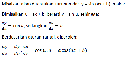 Nah, sekarang akan kita gunakan aturan rantai tersebut untuk menentukan turunan fungsi trigonometri pada sudut ax + b.