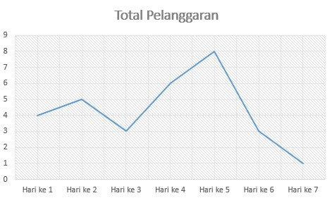 Dari gambar, bisa kita lihat jumlah pelanggar pada hari ke 1 ialah 4, pada hari ke 2 ialah 5, pada hari ke 3 ialah 3, pada hari ke 4 ialah 6, pada hari ke 5 ialah 8, pada hari ke 6 ialah 3, dan pada hari ke 7 ialah 1.