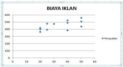 Contoh dari diagram pencar mengenai hubungan antara biaya iklan dengan penjualan produk :