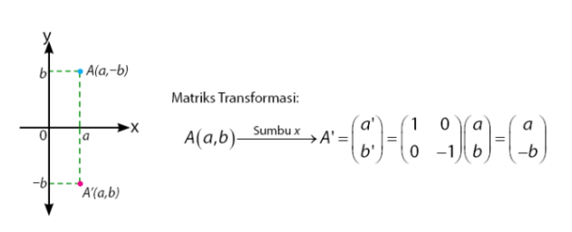Jenis matriks transformasi yang pertama adalah pencerminan terhadap sumbu x. Jika digambarkan maka akan menjadi sebagai berikut