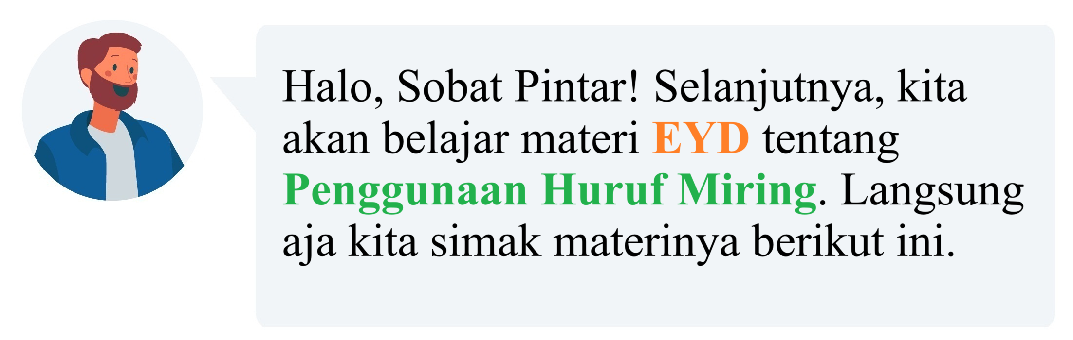 Huruf miring digunakan untuk menuliskan kata atau ungkapan dalam bahasa daerah atau bahasa asing.