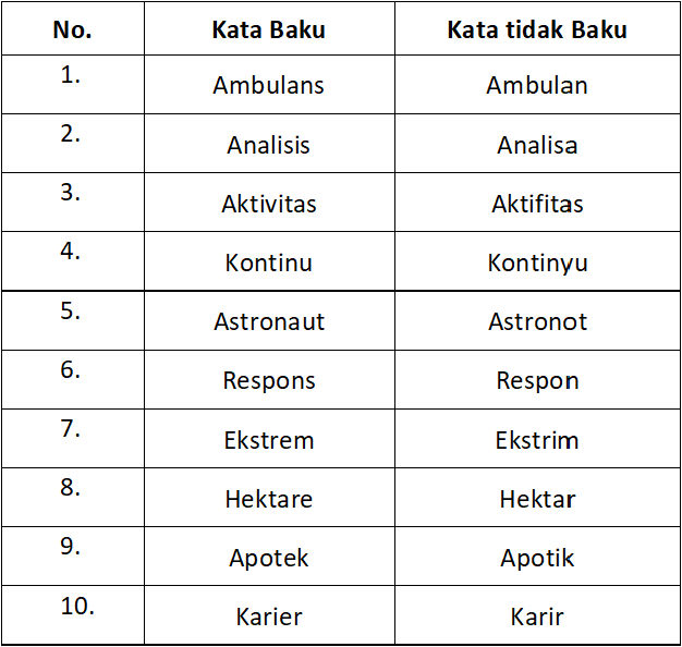 Soal mengenai kata baku selalu hadir dalam subtes Pemahaman Bacaan dan Menulis. Lalu, apasih sebenarnya kata baku itu sendiri? Kata baku adalah kata yang bersumber pada Kamus Besar Bahasa Indonesia dan sesuai dengan ejaan yang disempurnakan. Jadi, sebuah kata disebut sebagai kata baku jika kata tersebut terdapat dalam KBBI atau kamus besar Bahasa Indonesia. Berikut merupakan contoh kata baku dan tidak baku yang sering tertukar.